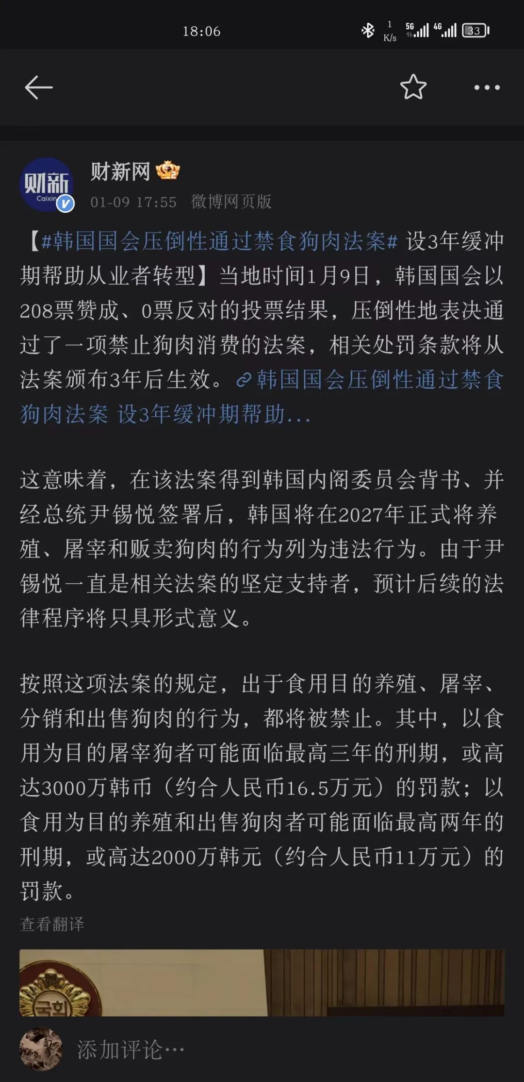 据财新网最新报道:韩国国会压倒性地通过了一个法案,禁止狗肉消费。这是韩国动物保护主义者的胜利,同时,零票反对,也标志着白左在韩国在韩国全面占据了政治舞台。而本届韩国政府,号称是一个右翼政府。同时,也在向世人宣誓,韩国的白左化程度,在东亚国家中,已经遥遥领先了。西方很多国家禁食狗肉,虽然一样有白左的影响,但是,不吃狗肉也是当地很长时间的传统。这种传统来源于近代欧洲工商经济的发展,而不是西方人更有爱心。19世纪以前,法国、德国、比利时等欧洲国家都有吃狗肉的历史。在物质匮乏的年代,人们为了填饱肚子,几乎什么都吃。狗肉正好是一种富含蛋白质的可靠来源。欧洲爆发了工业革命后,工业化生产从传统行业逐渐蔓延到了畜牧业,猪、牛、羊等家畜就此告别散养,统一进行工业集约化养殖。这时候原本适应力最强的狗,成了最不适合集约化养殖的目标,因为产出太低了,狗肉在欧洲的食品地位进一步降低。与此同时,欧洲人在生活水平提高后,开始把温顺的狗当作宠物,地位迅速提高,拥有伴侣动物成为高贵的象征,“狗是人类的朋友”则成为这些人的座右铭。狗成为宠物,是因为他没有猪难看,其实科学界已有定论,猪的智商要远远高于狗。“狗是人类的朋友”也是欧洲人对自己的养狗行为的自我美化。1870年普法战争中,普鲁士军队兵围巴黎后,城内的百姓因为粮食短缺,肉类更是奇缺,于是饥饿的百姓便将屠刀挥向了“他们的朋友”——狗,以至于到最后,巴黎都寻不见一只狗的踪影了。东亚国家由于农业生产落后 ,自古以来肉食都比较缺乏,并且发展出来各种肉食的美食做法,狗肉从来都是其中重要的一部分。