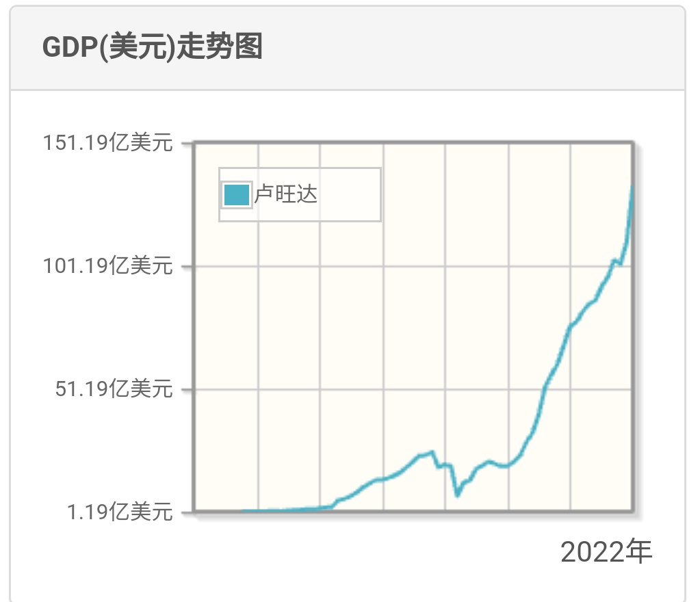 当年发生种族大屠杀的非洲国家——卢旺达,这些年飞速发展,持续十几年保持接近8%的年增长率,看看它的GDP增长曲线,是否很惊人?