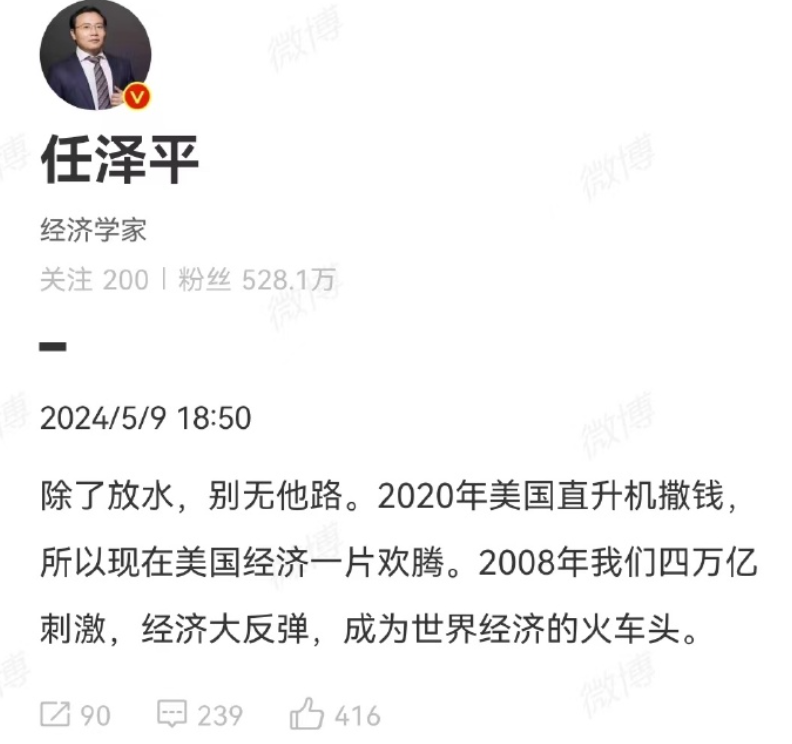 任泽平始终有一颗国师的心,当生育率下降,他呼吁央行直接发2万亿补贴生育。在他眼中,所有人都是母猪,只要你不断给他喂饲料,就能不断生猪崽。现在,经济下行压力大,他给出的建议还是发钞票