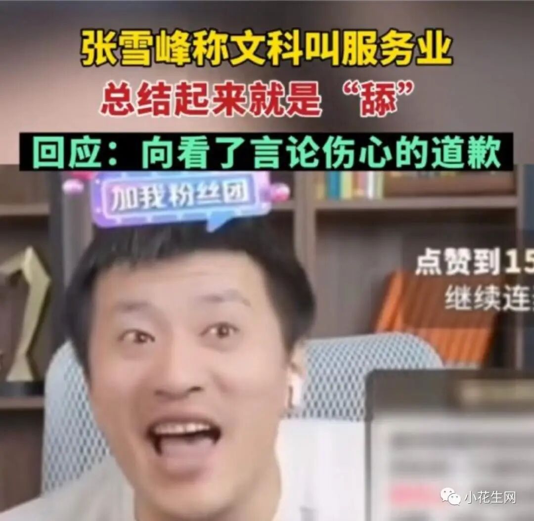 分,却不想学理科。张雪峰回复力劝家长千万别放孩子学文。他直接给了一个三段论:“所有文科专业都是第三产业”、“第三产业说白了就是伺候人的服务业”,“服务业总结成一个字儿,就是‘舔’。”