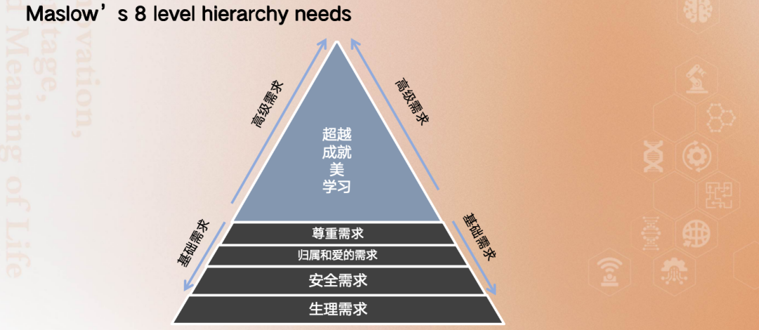 创新和传承是第五层需求自我实现的一种方式,所以相对于名利和享乐,亲情和爱情更加高级。这一点应当不难理解,一个人在物质享受达到一定水平之后就趋于满足,会更侧重于追求精神享受。更进一步思考,亲情和爱情固然必要,但是对于很多人来说,只有亲情和爱情也依然不够。当名利或者享受得到满足以后,如果没有更高层次的追求就会觉得空虚,与此形成对比的是,更高层次的自我实现的需求似乎永无止境。
