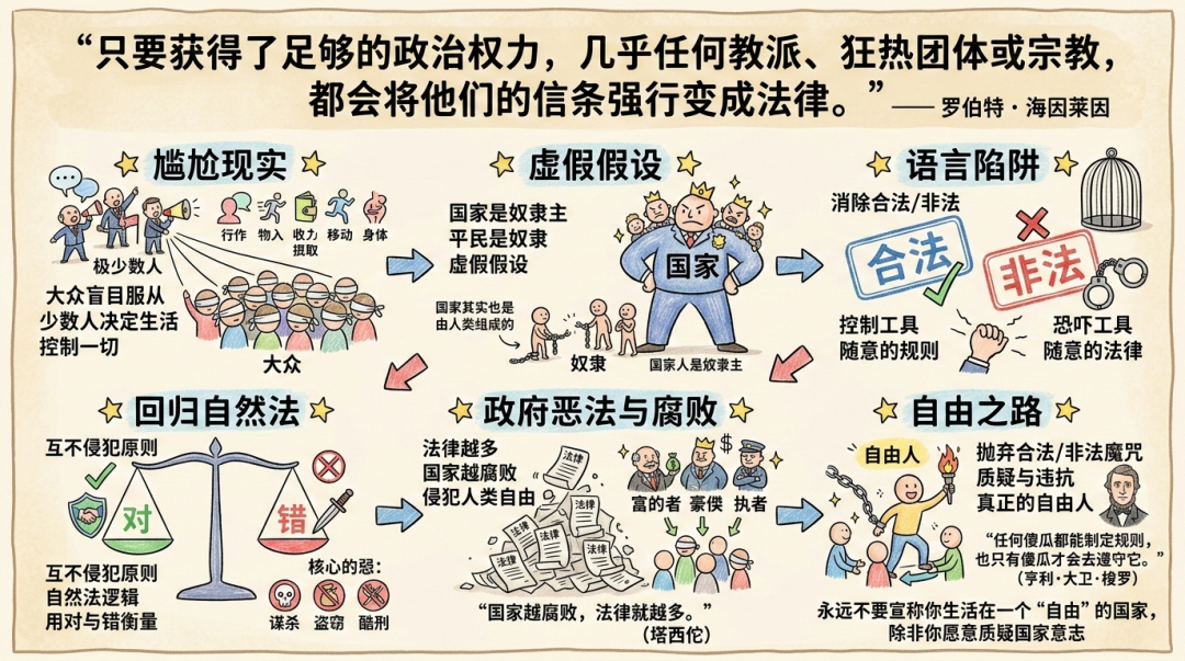 除了那些本就基于自然法理念(即互不侵犯原则)的法律之外,政府制定的绝大多数“法律”,其实是对全人类自由的残暴侵犯。