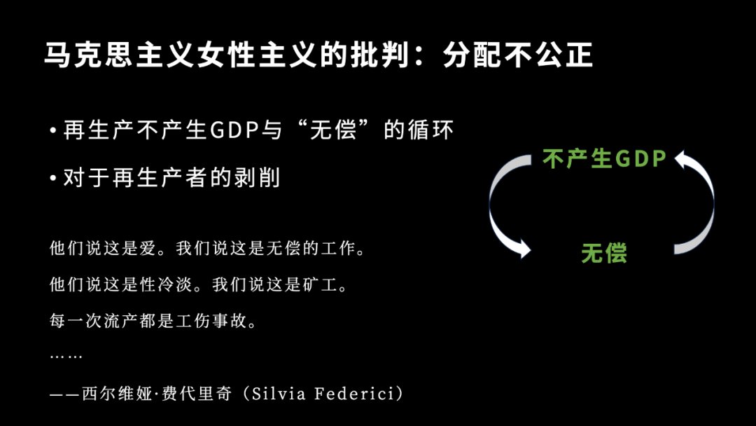 马克思主义女性主义提出再生产这个概念,恰恰是要提出这样一种批判:再生产没有回报,是我们今天这个社会里面的一种最大的分配不公正。这里面存在着一个无限循环:再生产得不到回报是因为它不产生GDP、不产生任何财富,因此大家就认为再生产活动不应该得到回报。所以它就变成一个无偿的活动。