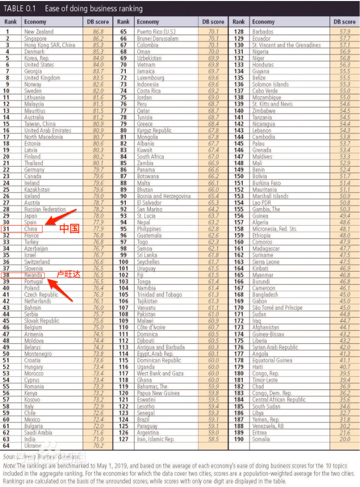 根据世界银行《2020年营商环境报告》中,卢旺达排名东非第一、非洲第二、全球第38位。这个排名共涉及190个经济体,中国排在第31位。