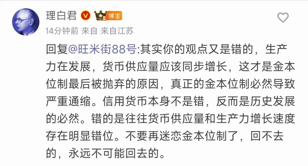 这话听起来像马某某。什么历史发展的必然?千百年来,人类都在使用金属货币,法定纸币系统,完全脱离黄金锚定,是从1971年开始的,这是人类历史的误入歧途。