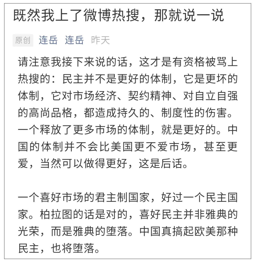 最近,知名专栏作家连岳,在个人公号“连岳”上发表了一篇谈论民主与市场的文章,随即引来几乎一边倒的批评——“也是没想到连岳有今天,前些年一直买我爱问连岳系列,那时他在公共事件上还算敢表达,这过了10年,这人嗖的一下就变成这副模样了......”“连岳就像活在蔬菜地里的兔子,觉得岁月静好,萝卜新鲜,一切都让人满意,狐狸只是传说,野兔让人憎恶,而土地规划委员的决议永远不会波及到这块蔬菜地。”连岳的文章真的一无是处吗?他到底错在哪里?究竟该怎么评判?哲学圣贤亚里士多德关于演绎法,有一个经典的“三段论”:大前提—小前提—结论。拆解连岳的文章:小前提:民主对市场经济、契约精神、对自立自强的高尚品格,都造成持久的、制度性的伤害。市场经济在君主制下会比民主制运行得更好。结论:民主并不是更好的体制,而是更坏的体制,它并非雅典的光荣,而是雅典的堕落,我们如果施行欧美式的民主,也将堕落。拆解后再来评判,就比较清楚了:连岳的大前提正确,但小前提、结论却全部错误。尽管连岳犯了两个常识性错误,但他有一个观点,也就是他推论的大前提——能释放市场活力的制度才是好制度,却是正确的。关于什么是好的制度,哲学家、政治学家、经济学家众说纷纭。连岳说,能释放市场活力的制度才是好制度。这个观点,应该说不仅正确,还很深刻。我们都知道,市场经济不仅通过分工提高经济效率,还推动创新,促进经济繁荣,最大限度的满足了人类的各种需求,更重要的是,它让人与人之间的关系发生了根本性的变化——即从身份到契约关系的转变。在市场经济下,人与人、人与企业,个体与政府之间的关系,都建立在契约,而非依附或者强制的基础之上。孟德斯鸠曾说:有商业的地方,就有自由、美德和法治。而能释放市场活力的制度,换句话说,就是能促进商业繁荣的制度。“释放市场活力的制度才是好制度”这本来是一个不证自明的东西,但常常被另一个争论所遮蔽。这就是我们听到最多的“到底是大政府好,还是小政府好”。事实上,这个争论常常会出现鸡同鸭讲的局面。比如,有人说,美国政府很大,却是世界头号强国;北欧等国家政府很小,不过就是二三流国家,可见,国家的强弱和政府的大小是成正比的。与之相反的保守主义思想,还有连岳在文章中提到的奥地利学派,却主张“小政府、大社会”,可见,后者是错的。之所以出现鸡同鸭讲的窘境,是因为这里的“大小”,并不是一个政府规模问题,而是一个属性问题;或者说,是强化市场型政府,还是抑制市场型政府的问题。美国著名政治学者曼瑟·奥尔森他在《权力与繁荣》一书中,提出了“强化市场型政府”的洞见:政府与市场是一体的,可谓一荣俱荣,一损俱损,市场繁荣,政府的财政税收就稳定,合法性就有保障;市场萧条,政府财政就入不敷出,自身地位就会动摇。奥尔森认为,来自市场外部的政府干预是不可避免的,但干预是有底线、有限度的,它绝对不会以繁荣为代价来压迫社会,因为,归根结底小社会对国家来说没有什么好处。可见,如果说政府规模大小取决于国家的人口、面积、经济社会复杂程度等地理因素,那么,如果要带领国家走向繁荣,政府首先必须是“释放市场活力”,能够有效地保护个人权利和维护市场规则。连岳“能释放市场活力的制度才是好制度”,基本上是奥尔森“强化市场型政府”的通俗解读版。连岳说:“民主并不是更好的体制,而是更坏的体制,它并非雅典的光荣,而是雅典的堕落,我们如果施行欧美式的民主,也将堕落。”这句话将雅典的民主与现代代议制民主划上了等号,但事实上二者早已不是一回事了。雅典民主,今天看来,的确是民主的幼儿期,但和同时代的斯巴达政体相比,无疑是一种伟大的进步,我们不能用今天的眼光来苛责2000多年前的古人。至于古典民主,到底是雅典的光荣,还是雅典的堕落,这个恐怕不是一个问题,而是完全不同的两个问题。首先,古典民主肯定是雅典的光荣。包刚升老师在《民主的逻辑》一书中总结了雅典民主时代的三大成就,分别是:· 哲学、科学与文学上令人惊叹的成就,仅苏格拉底、柏拉图、亚里士多德“希腊三哲”足以让绝大多数文明望其项背;· 适龄儿童接受学校博雅教育。即便今天,很多国家也还没有做到博雅教育。包刚升老师说:这些成就的取得,与雅典的民主政体密不可分。如果雅典民主真如连岳说的不堪,今天我们提及西方文明时,也不可能“言必称希腊”。其次,雅典民主的局限性,的确加速了雅典的堕落。《民主的逻辑》一书,总结了雅典民主的三大局限:此后2000多年的时间里,民主在西方一直都是邪恶的化身。英国思想家弥尔说:“以对付野蛮人而言,专制就是合法的。”然而,随着历史的演变,民主也会进化。西方的思想家、政治家开始给雅典民主打补丁,其中最重要的两个补丁,分别是法治与代议制,逐渐形成了连岳文中的“欧美民主”,也就是进化后的现代民主。连岳将现代民主等同于雅典民主,从逻辑上,应该叫偷换概念,从政治学原理上,忽视了现代民主给雅典民主打的两个补丁。从包刚升老师《民主的逻辑》一书中,不难发现这两个补丁及其特点:法治不仅仅是王在法下,权力要受到约束,民众也必须在法下,既要防君主的暴政,也要防民粹。显然,法治首先是限权的宪法之治。法治不仅约束权力,还要限制