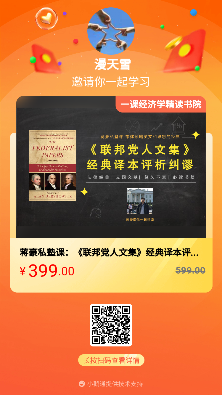 蒋豪老师开讲《联邦党人文集》,在这里购买,享受专属优惠。![]()