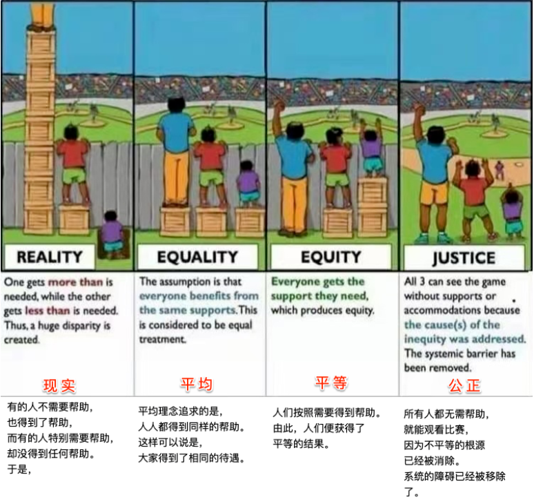 下面这张图你可能看过也可能没看过,现在你可以花一分钟看下这张图,看看这张图所解释的现实、平均、平等和公正,是不是和你心里想的一样。在往下继续看我的文章之前,你也可以试着想想自己的答案,看看是不是跟我要说的一样。1