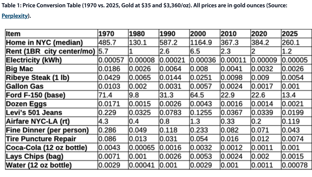 看这张表,里面商品的价格,全部用金盎司来计价,包括住宅、出租公寓、电力、巨无霸汉堡、牛排、1加仑汽油、福特150卡车、1打鸡蛋、李维斯501牛仔裤、从纽约到洛杉矶的机票、纽约的精致晚餐、汽车轮胎爆胎修复、1瓶可口可乐、乐事薯片和1瓶水。