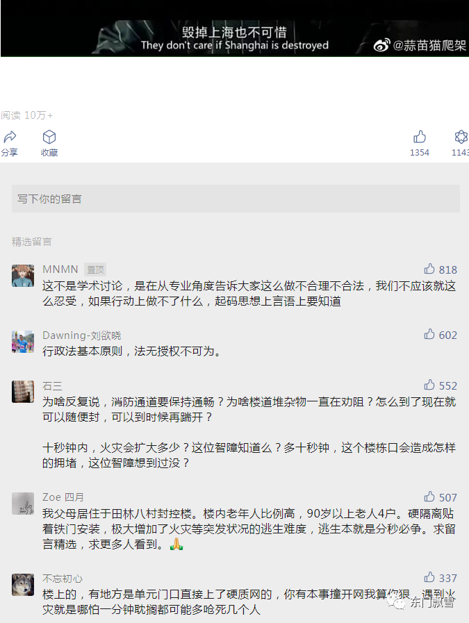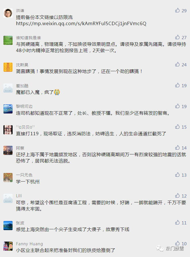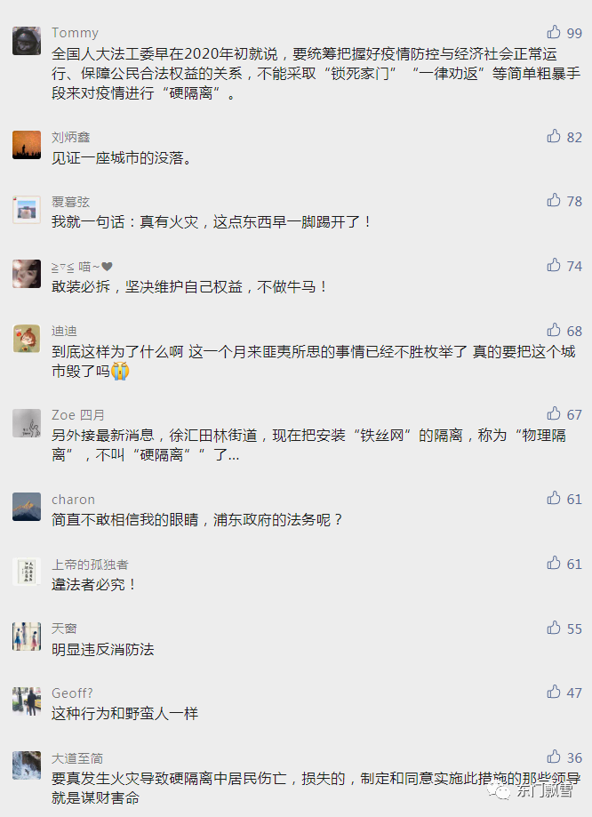 “硬隔离”措施带有强烈的不信任、甚至侮辱性的成分。目前上海居民已经接受政府防疫部门发布的命令,居家隔离,足不出户。增加一道物理上的措施,无疑是对于阳楼居民的不信任,怕人跑脱。现实生活中,只有监狱、司法机关、精神病院、动物园等才会对相关场所采取物理隔离的方式,对于居民住宅拉铁丝网、上钢板,不是我们人类对待正常同类的方式。