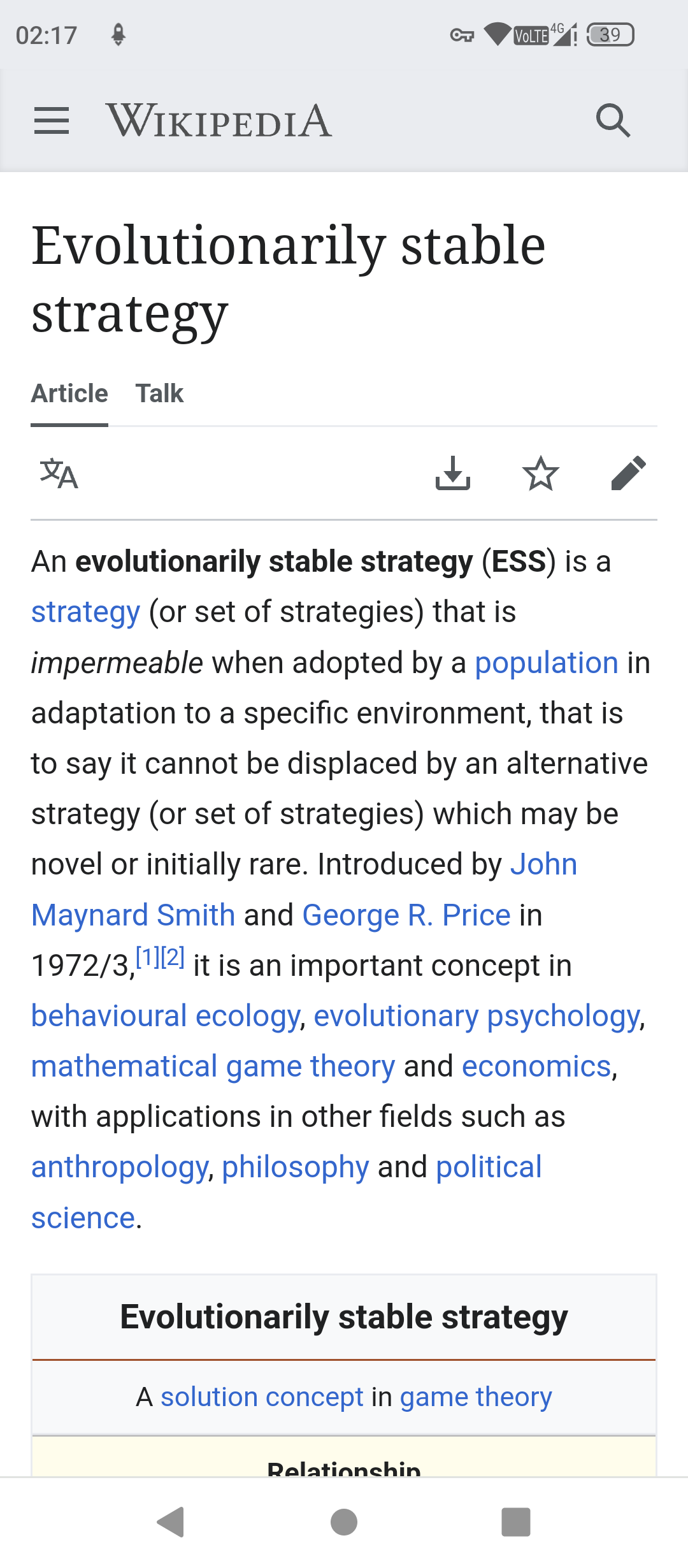 这些策略在进化环境中逐渐达到动态平衡,这就叫evolutionary stable strategy 。