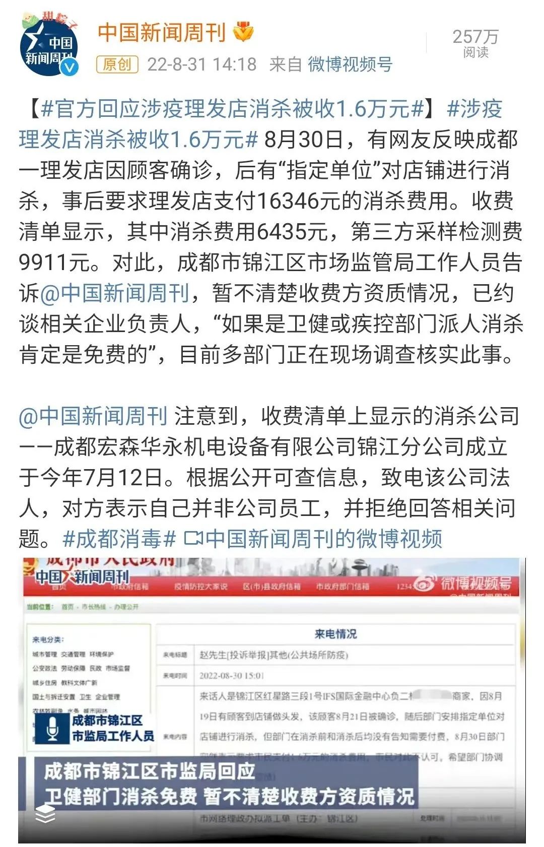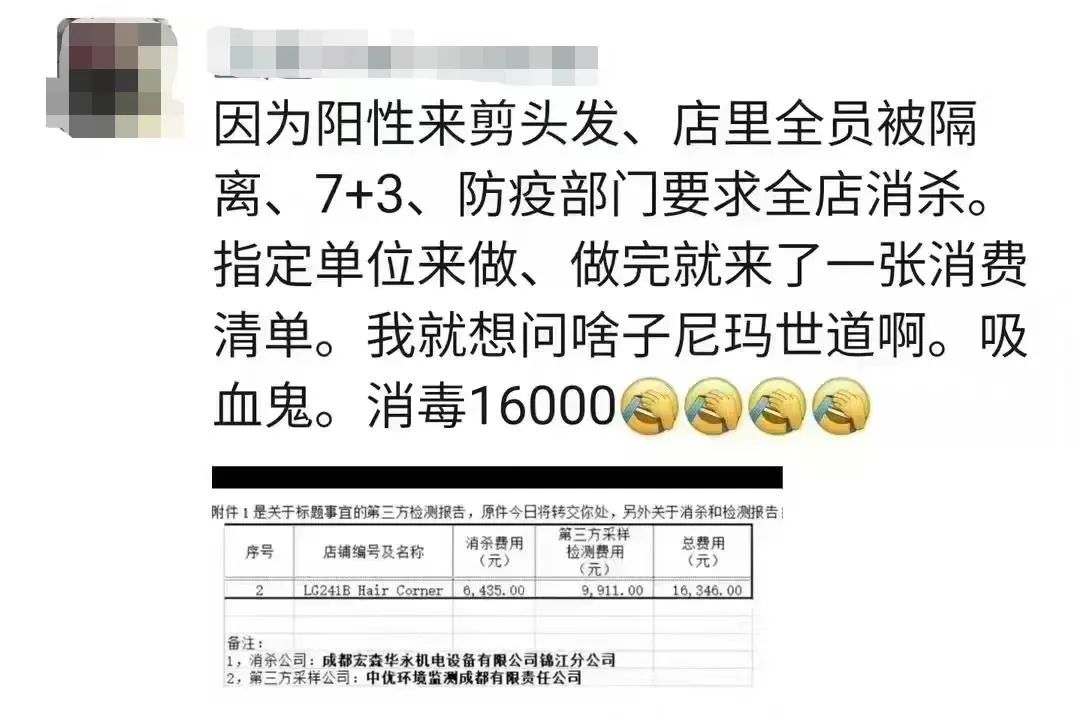 冠冕堂皇的事情背后,都有经济动因;甚至可以说,越是冠冕堂皇,就越是想隐藏背后的经济动机。成都市一家理发店因有顾客确诊,一个指定单位——成都宏森华永机电设备有限公司锦江分公司——进行上门消杀,收费16346元,其中消杀费用6435元,第三方采样检测费用9911元。这家公司今年7月12日才成立,负责人叫杨梅;其总公司成立于2017年8月,负责人是同一人,参保人数为6人。你不得不“佩服”某些人的“嗅觉”,成都最近疫情挺严重的。当然,人家之所以“嗅觉灵敏”,肯定是因为有人给指路,所以一嗅一个准。当你知道消杀一个理发店需要1.6万之后,马上理解了当初上海破门而入进行“终末消杀”的人为什么这么积极。尽管专家早就说,相关物体上的病毒不可能长期存活,消杀只应该在确诊病例曾经聚集的地方进行,但是他们“为了人们的生命安全”,还是要挨家挨户进行消杀,哪怕是以私闯民宅的方式进行。所以你看到有些人开着车,像发动一场生化战争和好莱坞大片特效一样,雄赳赳气昂昂通过整条街道,像撒白灰一样把街道搞得狼烟四起,那可是多少个1万6啊。![]()