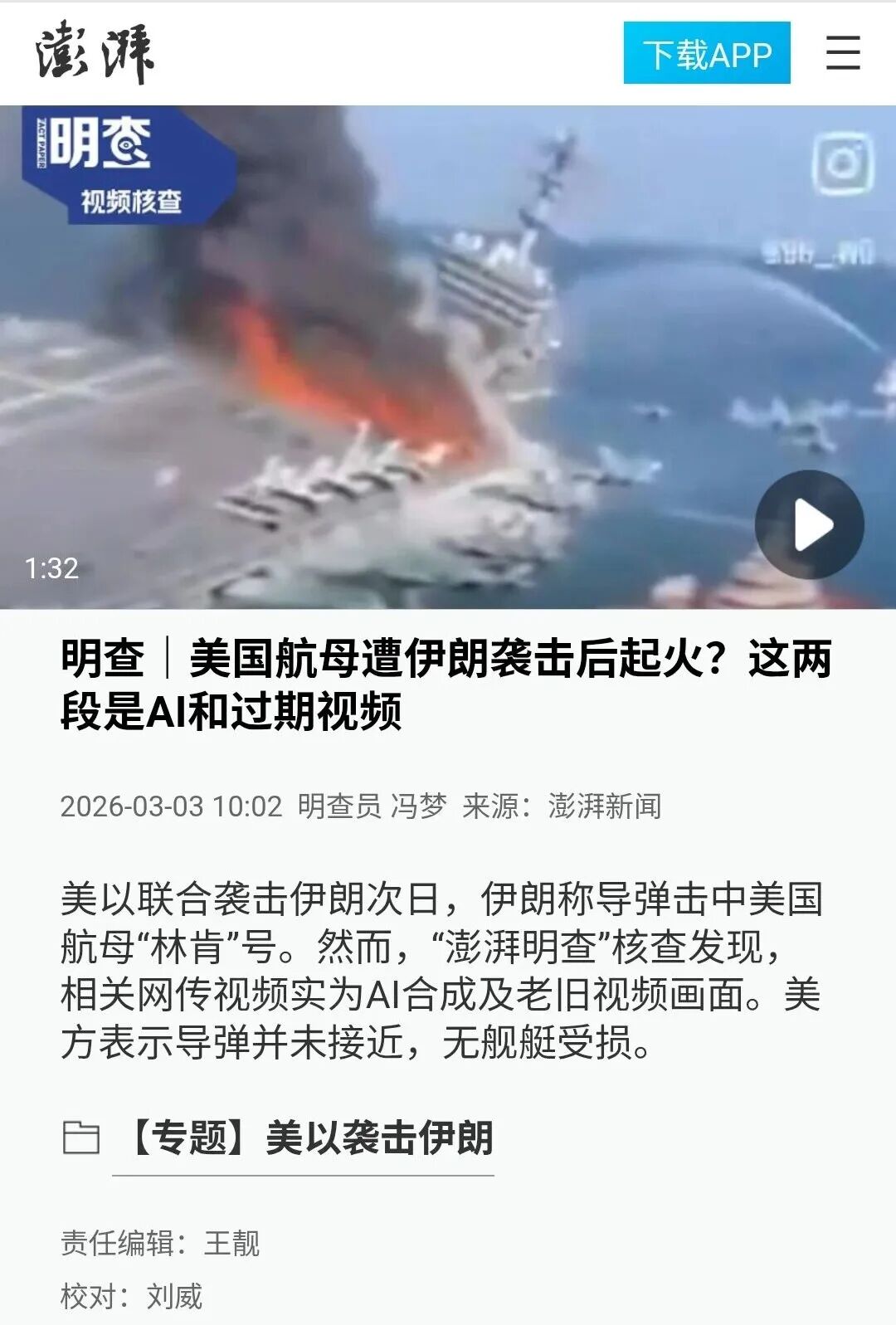 综上:伊朗目前为止,从未击中美国航母,今后也不会有这种可能,澎湃新闻也对此做了辟谣,如下: