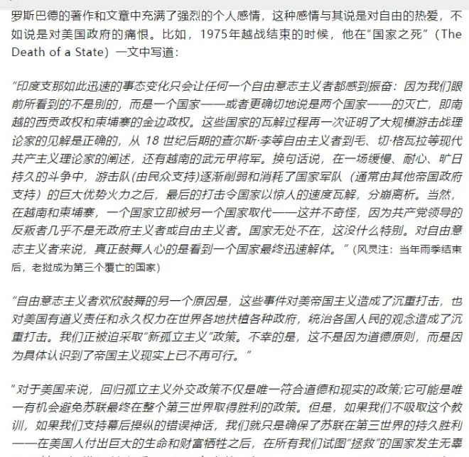 至于文章中说罗斯巴德就是“美国的敌人必然就是朋友,美国的朋友必然就是敌人。如果美国政府反对圣战分子、法西斯分子和其他自由的敌人,他们就会公开支持这些组织。”说真的,这就是以自己低劣的智商在衡量罗斯巴德的智商。罗斯巴德太清楚敌人的敌人并不一定是朋友,反而仍然是敌人了。看看他写的《左与右:自由的前景》,就知道你们对敌友的理解多么肤浅,罗斯巴德是多么深刻而清醒。所以这种话跟我们在讨论中说,泽连斯基也是侵略者和压迫者,他们马上得出一个结论:你们亲俄,是一回事。这是大脑熄火的表现。截取一段话,不理解其中的逻辑,也没有上下文,得出了一个结论:罗斯巴德亲共、米塞斯支持纳粹、霍普是种族主义者和反同。这是很弱智的,是会被同行笑话的。这种观点丝毫不会损害罗斯巴德的声誉,只会暴露自己的不学无术。一个对内可能很严苛的国家,外交政策可能很温和。因为他们的主要目标是坐稳位子,因此罗斯巴德说与他们的外交是“防御性的,恐惧性的和有安全意识的”,并没有强烈的进攻性。反倒是民主国家,以美国为首,外交上是进攻性的。原因主要还是背后的经济动机,但是以推行所谓的价值观之名,将真实动机掩盖起来了;以及他们过去的自由,为这种进攻性提供了经济基础。理解这一点,非常重要,对我们理解当今国际政治,大有裨益。