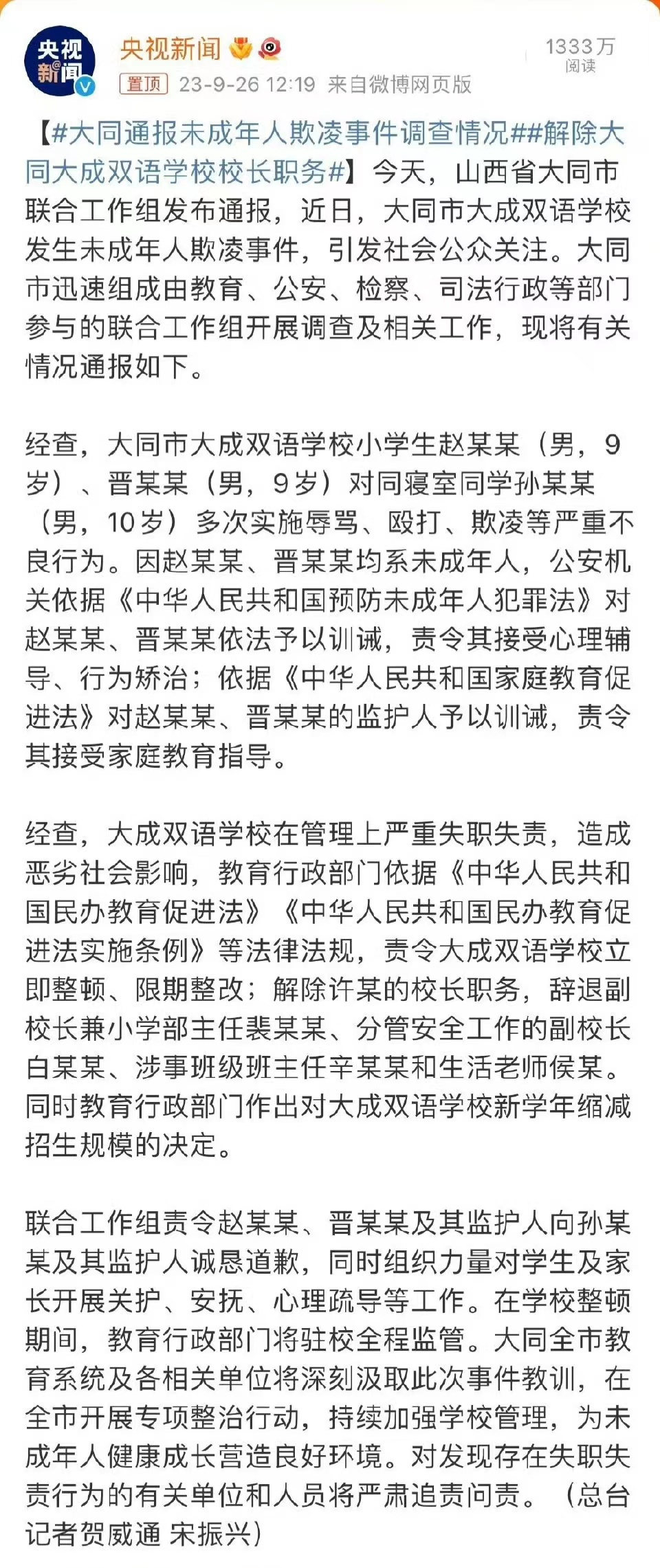 山西省大同市大成双语学校发生一起未成年人欺凌事件,这其中的细节,让人不堪入目,还是令人发指的。