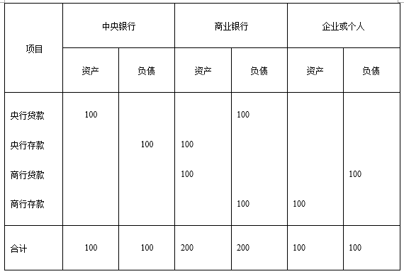 央行给商业银行放一笔贷款,假设是100亿。商业银行只能在央行开户,又把这笔钱存入它在央行的户头上。这时候,央行的资产和负债同时增加100亿,商业银行的资产和负债也同时增加100亿。商业银行把这些钱放出去,企业就形成了100亿的商业银行存款,市场上“流通货币”就有100亿了。见下表:
