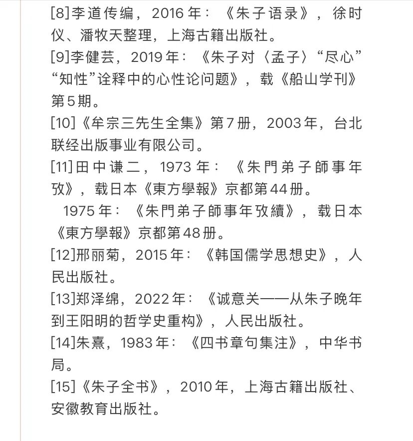 我找个对照论文给大家感受一下,同为浙江大学新百人计划年轻博导的江佳凤老师发表的论文《朱子“尽心”章诠释中的知行问题》,都是一万多字的篇幅,人家的参考文献是这样的: