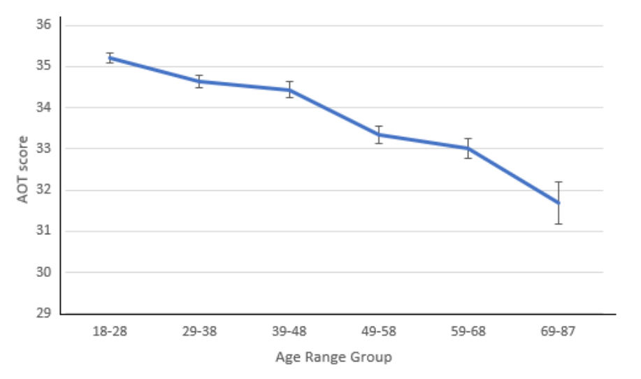 年轻人无所谓,信念还没有固化,可以被事实修正。但是随着年龄增长,人们越来越不愿意改变。下图中这个研究 [4] 表明,积极开放思维得分随着年龄一直在下降。