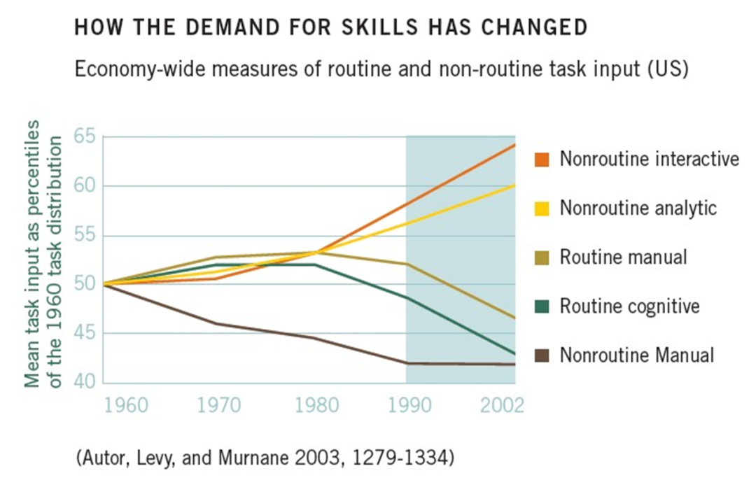 尤其过去绝大多数工作岗位不需要持续学习。下面这张图描写了1960到2002年间,美国的工作岗位对不同技能的需求 ——