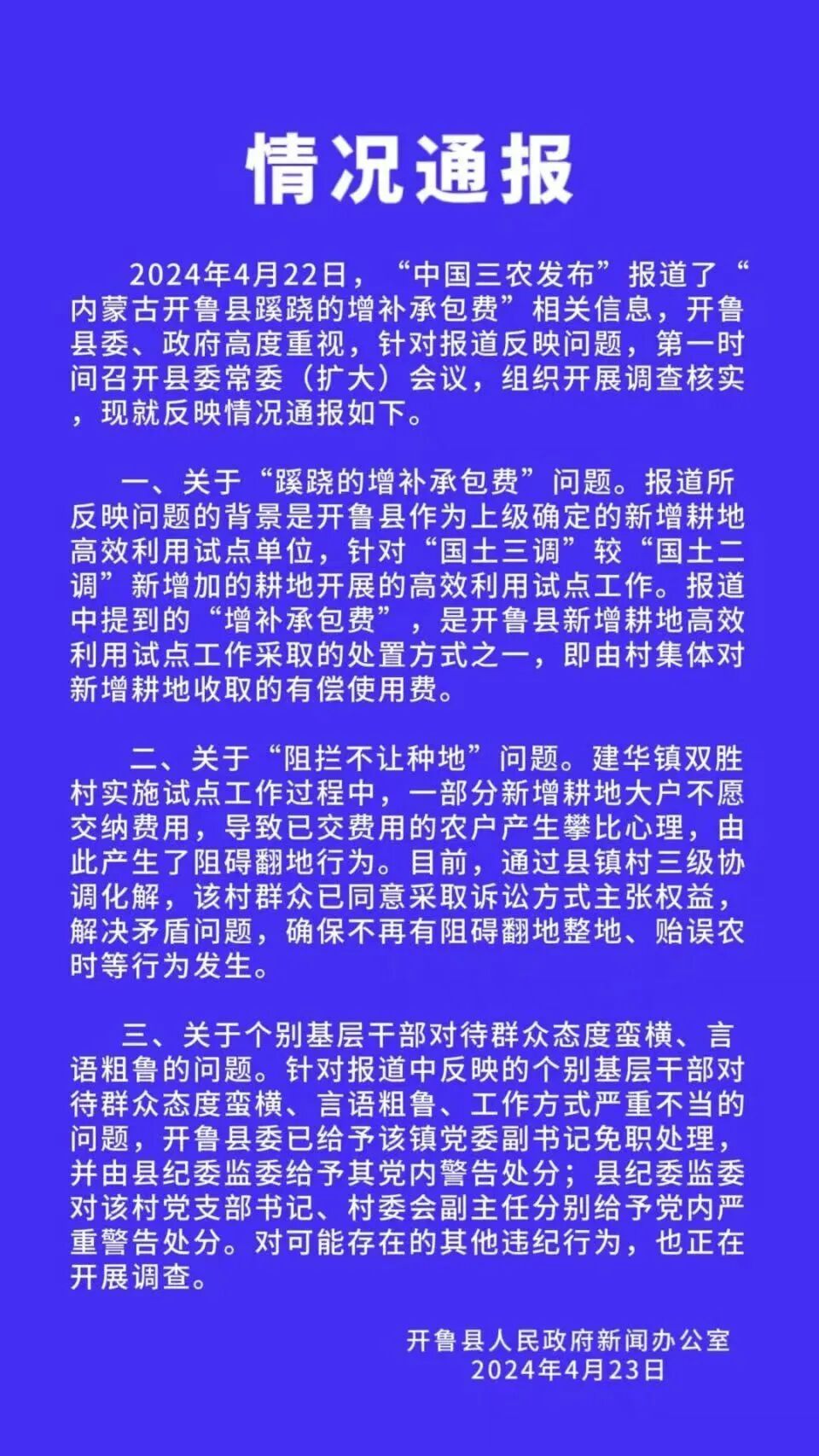 关于“蹊跷的增补承包费”问题。报道所反映问题的背景是开鲁县作为上级确定的新增耕地高效利用试点单位,针对“国土三调”较“国土二调”新增加的耕地开展的高效利用试点工作。报道中提到的“增补承包费”,是开鲁县新增耕地高效利用试点工作采取的处置方式之一,即由村集体对新增耕地收取的有偿使用费。