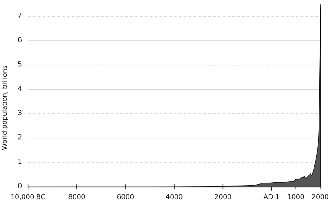 这张图最左端就是公元前1万年,文明产生之前的世界人口数,最右边是公元2000年的世界人口数。公元2000年全世界大概有60亿人左右(今年已经是80亿)。公元前1万年呢?全世界大概只有1百万到1千万人。