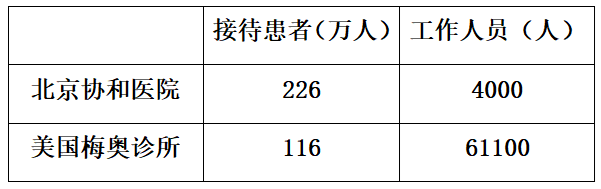 同样是中美最好的医院。梅奥诊所的医护人员是协和的15倍,接诊人数却只有一半。15倍的医护人员,1/2的接诊人数,这意味着协和的效率是梅奥诊所的30倍。