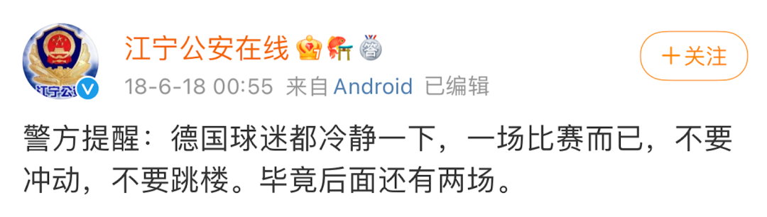 而且2018世界杯特别坑,从小组赛就开始大爆冷门。比如卫冕冠军德国,小组第一场居然会输给墨西哥,无数人输了个溜光。著名警察账号“江宁公安”凌晨发微博“安慰”大家,惹得很多球迷非常“感动”。