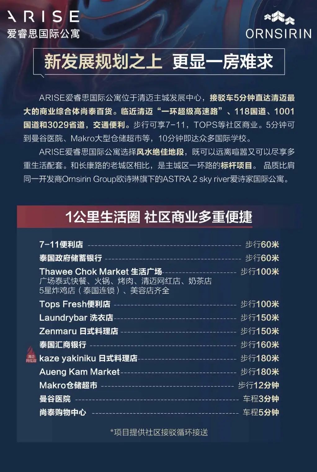 1.开发商合作方够硬:ornsirin在清迈无疑是第一开发商,有30多个地产项目,他的董事长是前清迈市长。这次公寓合作的教育集团和医疗方也都是业内顶级。项目定位特别适合养老客户。