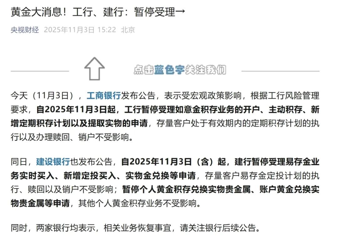 先是国家税务总局的一纸公告,瞄准了黄金交易的“发票”,紧接着,工行、建行等“宇宙大行”紧急宣布:暂停“积存金”的实时买入和实物兑换!