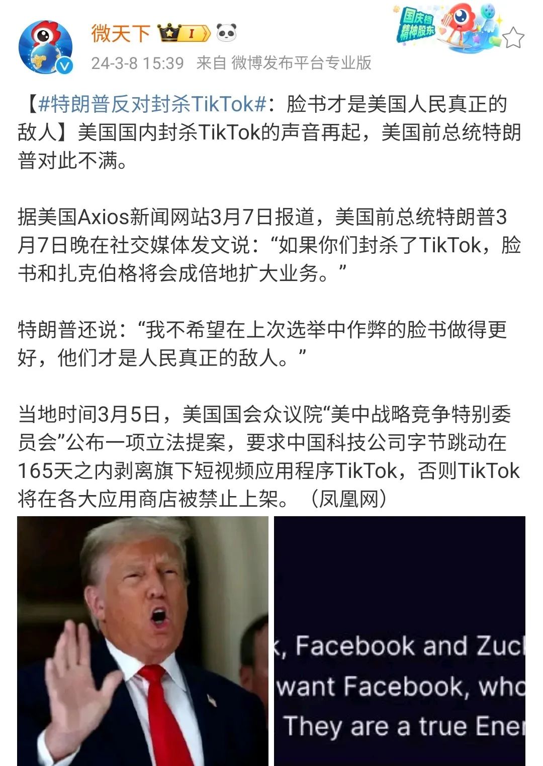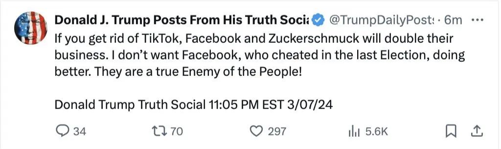 在美国国会以国家安全、信息安全之名要求张一鸣剥离Tik Tok业务,否则将被禁止上架后,川普3月7号发文,称如果封杀Tik Tok,Facebook和扎克伯格将成倍扩大业务,而他们才是美国人民真正的敌人。![]()