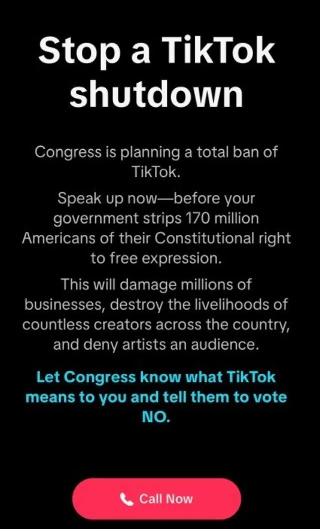 这弹窗的意思是说,美国国会正在剥夺1.7亿美国人的言论自由,损害数以百万计的企业和民众的生计,所以你们都给国会打电话表达你们的反对意见吧。