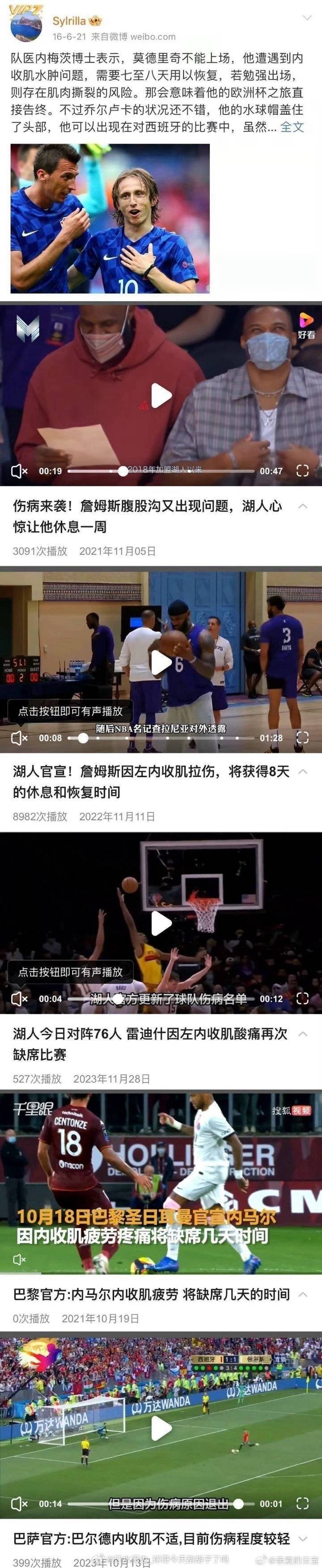 他在视频中所说的内收肌不适,有人整理出了类似伤情的恢复时间,图片我贴在最后,感兴趣的可以看下。