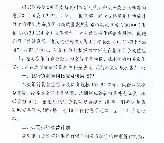 2022年12月30日,贵州遵义市最大城投发债主体——遵义道桥建设(集团)有限公司在中国债券信息网披露了关于推进银行贷款重组事项的公告称: