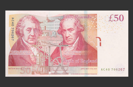 2011年版的50英镑上,左边为博尔顿,右边为瓦特。