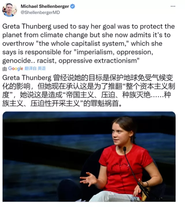 格雷塔这种人,就是完全不顾人类死活也要实现他们的环保目标的恐怖分子,他们反对城市、高楼大厦、汽车、空调、工业化生产、廉价能源和电力供应等等一切造福人类的东西,反对人类选择的现存秩序,试图颠覆一切,尽管他们自己就生活在市场经济中并从中受益。