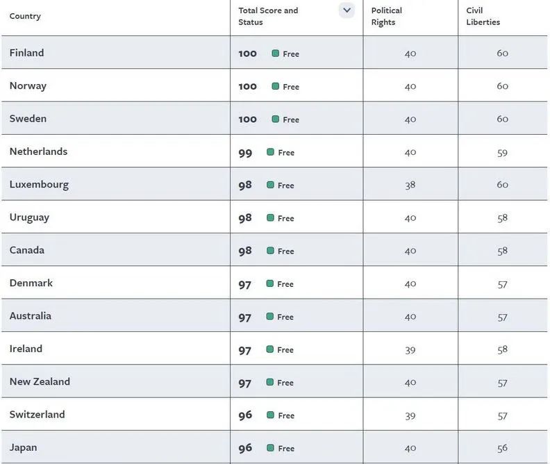 我是个很在乎个人自由的人,所以我对移民国的评价的重要因素之一就是自由度。