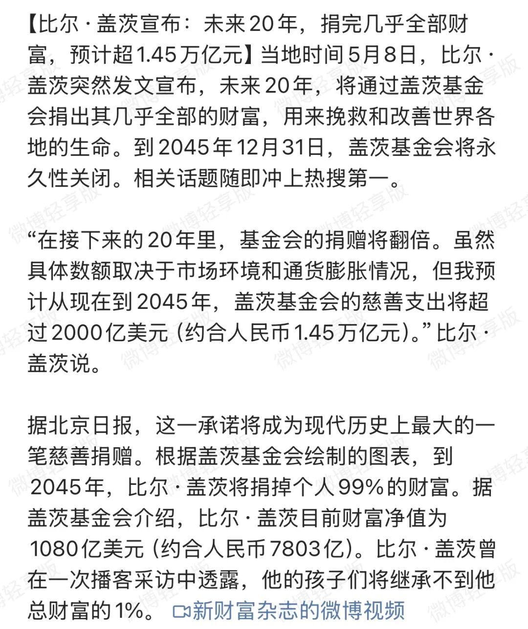 比尔盖茨这次不是捐给基金会,因为他早就裸捐了,他是决定把他捐给基金会的所有钱,在未来20年内分散给社会,特别是救助第三世界的儿童,真正的散尽家财!(1%的财产由子女继承)