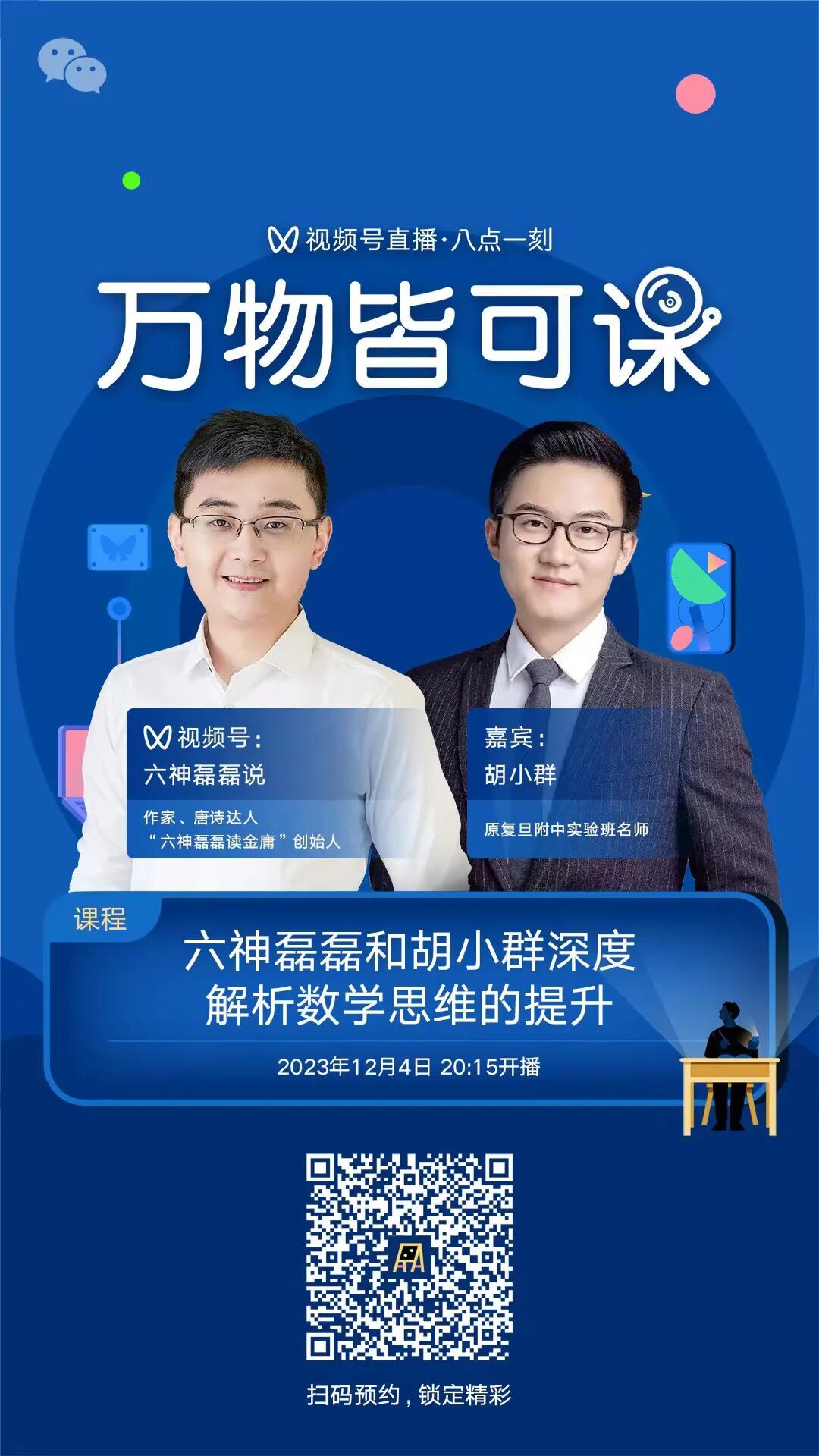 归根结底,还是因为没有放弃学习,尤其是没放弃关键的一门数学。假如高一、高二的数学课完全躺平,光靠高三后半段,是不可能追回来的。每每回想起来,总觉得幸运。老话总说“贵在坚持”,其实,一个人坚持自己狂热喜欢的事,是容易的;真正难的反而是能坚持一些并不那么喜欢、但又很重要的事。每一个有趣的梦想,都需要做好很多你觉得“无趣”的事情来呵护。就像田伯光,兴趣明显不在于刀法,但他一直都在苦练快刀。最后,也想很开心地说一件事,也是今天要郑重推介的主题。觉得文科好、理科差的同学们都可以关注一下。我请到了一位数学名师,4号来做客我的视频号直播间,就是原复旦附中的胡小群老师。他是凭真才实学火的,现在非常出圈。给尚不熟悉的介绍一下他的履历。胡小群老师毕业于复旦大学数学系,毕业后在复旦附中做数学老师,负责带复旦附中的各种实验班(创新实验班/文科实验班等)。后来他的数学课迅速在网上火了。注意他不是那种“主流口诀大招”,也不是鼓吹刷题打鸡血的套路,而是讲数学的底层逻辑,娓娓道来,各位可以去询问别的听过的家长,实力如何,一问便知。啰嗦几句,一位名师的重要性,是不言而喻的。好老师能指点一下,也许就少走很多弯路。金庸小说里,做题家刘瑛姑苦研数学十几年,却算不过黄蓉,因为黄蓉有名师——她爹。这也是互联网的意义。很多孩子可能没有机会去复旦附中上实验班,也不会有那种全国拔尖的老师,但在视频号里,大家一样能够得到真传,哪怕是片言只语,我想也会有意义。微信视频号官方对这场直播也非常重视,特意给我们安排了8点15板块。有感兴趣的朋友,点这里,或者预约4号晚8点15的直播,免得错过。