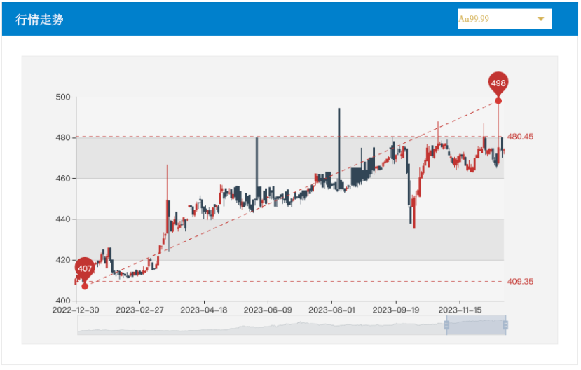 (2023年黄金价格走势图,来源:上海黄金交易所)