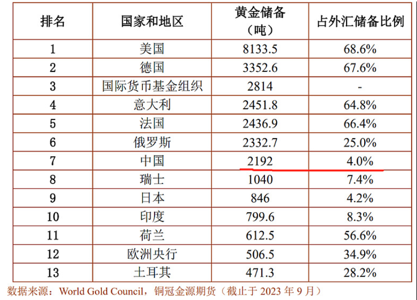 根据世界黄金协会数据,截至10月底,中国央行黄金储备为2214.6吨,占外汇储备之比为4.3%。