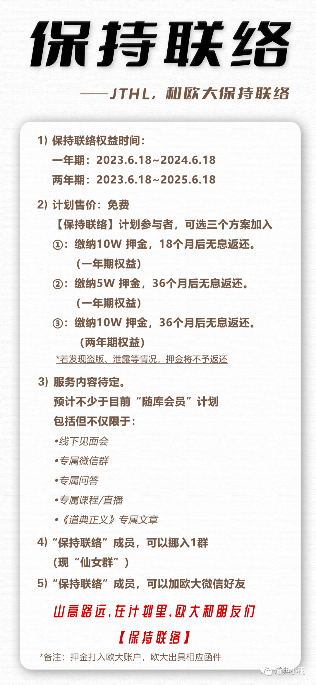 随酷会员制度统一将于2023年6月18日权益到期,到期之后不再继续售卖随酷会员身份。6月18日之后,还想要与欧大保持联系的库友,可以考虑加入欧大“保持联络计划”,缴纳押金免费与欧大保持单线联系,具体加入方案可以扫码联系小助理。