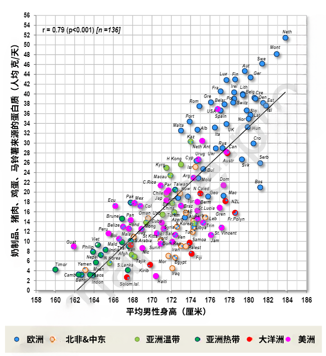 欧洲国家整体的蛋白质摄入量较高,所以更强调蛋白质的质量对成年身高的影响,而在欧洲以外的地区蛋白质摄入水平一般甚至较低,因此更强调蛋白质的数量对成年身高的影响。