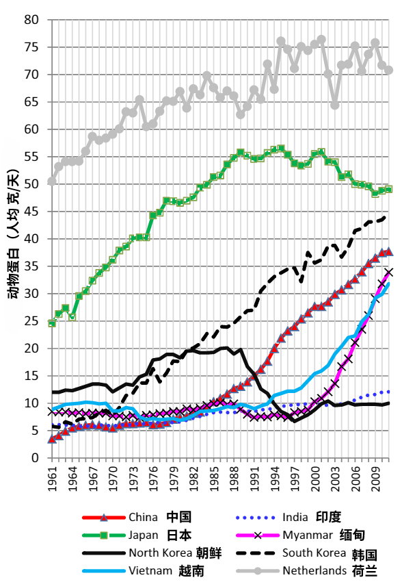 △ 亚洲7国与荷兰对比,动物蛋白消费量趋势变化