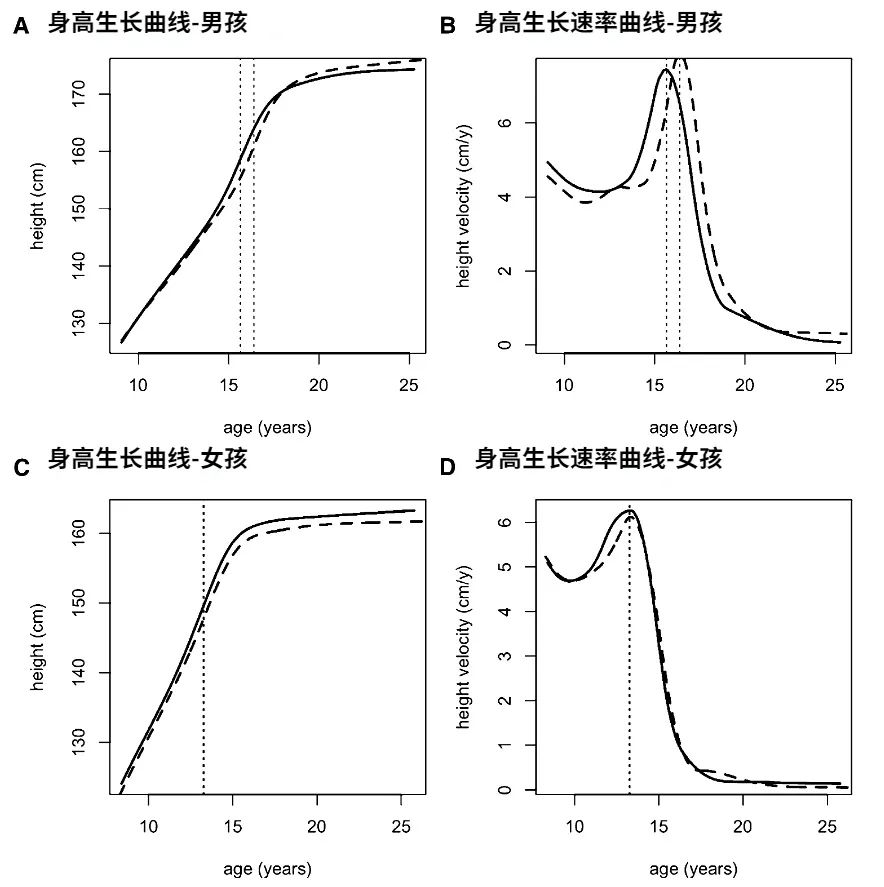 结果显示,和对照组相比,补钙的实验组男孩在青春期中期(15.5岁)平均身高更高(2.0±0.8 cm; P = 0.01),更早地达到生长爆发期,平均提前7.4个月。但最终,他们身高停止发育的时间点也来得更早,成年后(平均年龄23.5岁)补钙组男孩比对照组男孩矮了将约3.5厘米(3.5±1.1 cm;P=0.002)。
