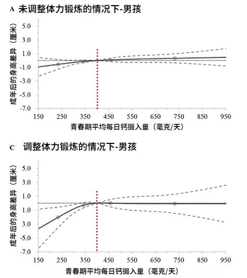 在我国目前还是以植物性饮食为主的情况下(谷类、豆类、蔬菜摄入多,动物性食物摄入少,奶制品几乎很少摄入,人均钙摄入量在300-400毫克/天),青春期男孩钙摄入量少于300毫克/天,与成年身高更矮有关。然而,钙摄入超过400毫克/天也并不会导致成年后身高更高,钙摄入超过570毫克/天与身高生长速度更快有关,但对未来身高并不会有什么影响。