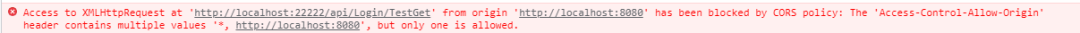 Access to XMLHttpRequest at 'http://localhost:22222/api/Login/TestGet' from origin 'http://localhost:8080' has been blocked by CORS policy: The 'Access-Control-Allow-Origin' header contains multiple values '*, http://localhost:8080', but only one is allowed.