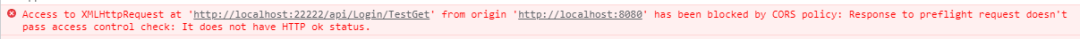 Access to XMLHttpRequest at 'http://localhost:22222/api/Login/TestGet' from origin 'http://localhost:8080' has been blocked by CORS policy: Response to preflight request doesn't pass access control check: It does not have HTTP ok status.