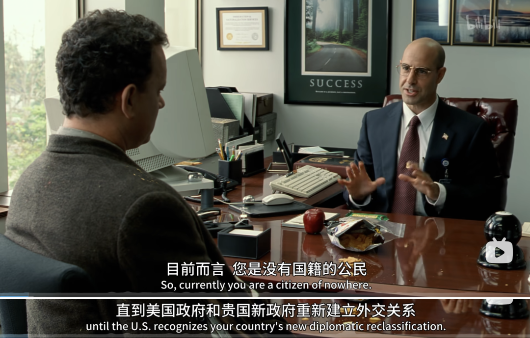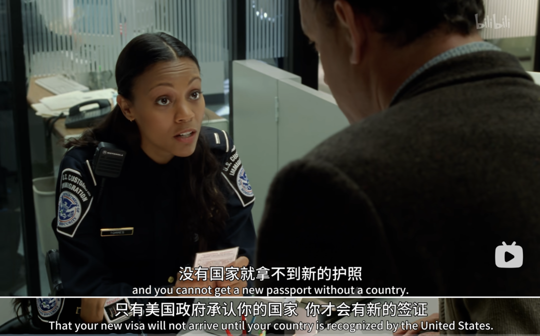 电影中他也曾经有机会跳出去,只要他签署一份声明,承认他害怕他的祖国,他就可以成为难民,获准离开机场进入美国。