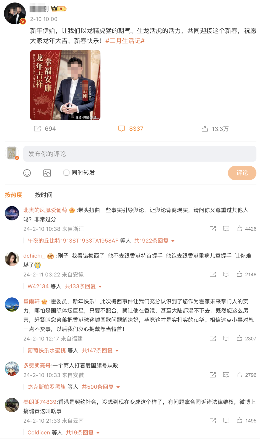 霍的微博和外网Ins评论区已经完全是另外一副景象,他自己删除了年前的一条微博,最近这条拜年的微博评论区基本上也翻车了。