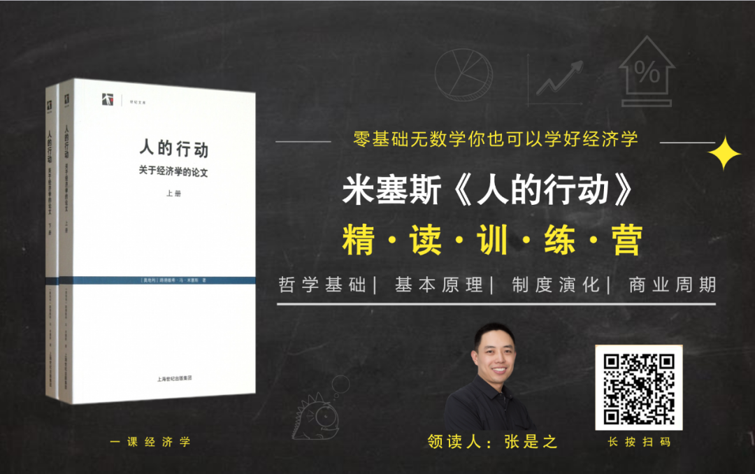 最后推荐一下张是之老师精心开发的课程:米塞斯《人的行动》精读训练营。《人的行动》是奥派一代宗师米塞斯的集大成之作,也是我推荐的奥派经典必读书目。但是这本书对初学者来说有一定难度,特别是前面几章关于哲学认识论、方法论部分,并不是很好理解。
